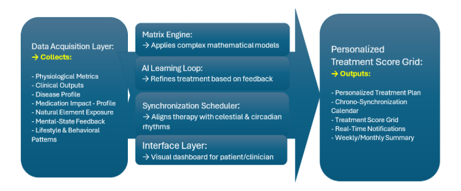 Computational engine: Using mathematical optimization, the system builds a Personalized Treatment Score Grid, ranking each therapy by six factors: Effectiveness, Safety, Circadian Fit, Adherence, Mental Support, and Learning Gain.